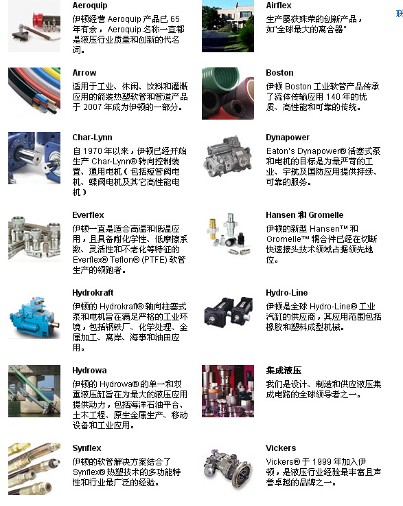 在流體動(dòng)力元件或系統(tǒng)方面,鮮有公司能夠與伊頓匹敵。 我們擁有諸如 Aeroquip、Airflex、Char-Lynn、E. Begerow, Hansen & Gromelle、Hydro-Line、Hydrokraft、Hydrowa, Integrated Hydraulics、Internormen、Synflex、Vickers 和 Walterscheid 等傳統(tǒng)品牌,可提供廣泛的產(chǎn)品,滿(mǎn)足從石油和天然氣到農(nóng)業(yè)等多樣化市場(chǎng)中應(yīng)用的需求.