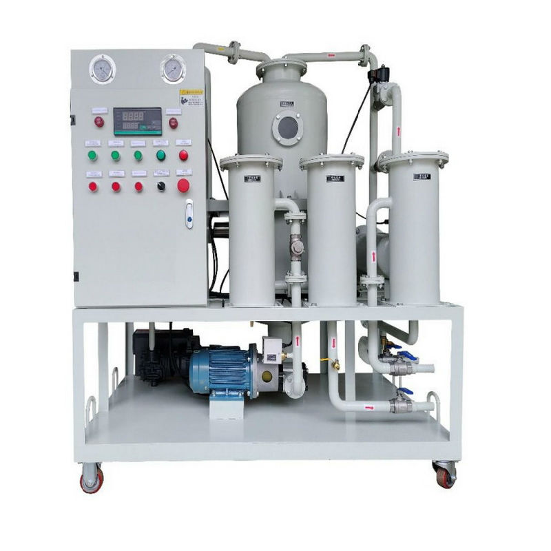 設備工作時,油液在內(nèi)外壓差的作用下首先經(jīng)入口進入粗濾器,其內(nèi)裝有不銹鋼濾網(wǎng),待處理油流過時,油液中所含的大顆粒雜質(zhì)被截留;經(jīng)粗過濾后的油液在壓差作用下繼續(xù)通過加熱器進行熱交換加熱;經(jīng)加熱后的油液繼續(xù)進入極低氣壓的真空分離器內(nèi),其內(nèi)利用分子分離技術原理對油液進行變壓解析、真空滯留、內(nèi)急立體蒸發(fā),消除分子間的結(jié)合力,使油液中所含的溶解水、溶解氣體、游離水、游離氣體等快速潰破油膜脫離油分子而析出;油液進入真空分離器內(nèi)先形成霧狀,再形成膜狀,使其在真空中的接觸面積擴大為原來的數(shù)百倍。油中所含的水分在高熱、高真空度、大表面、高抽速的條件下得到快速汽化并由真空系統(tǒng)排出;經(jīng)脫水、脫氣后的油液再經(jīng)排油泵泵入二級過濾器,細微顆粒雜質(zhì)被攔截;油液在壓力作用下繼續(xù)進入精濾器,其內(nèi)為復合微孔結(jié)構(gòu)的過濾材質(zhì),能有效吸附攔截油液中的超微顆粒雜子;最后經(jīng)出油口流出的油液即為潔凈油,從而完成整個油液的凈化過程。
