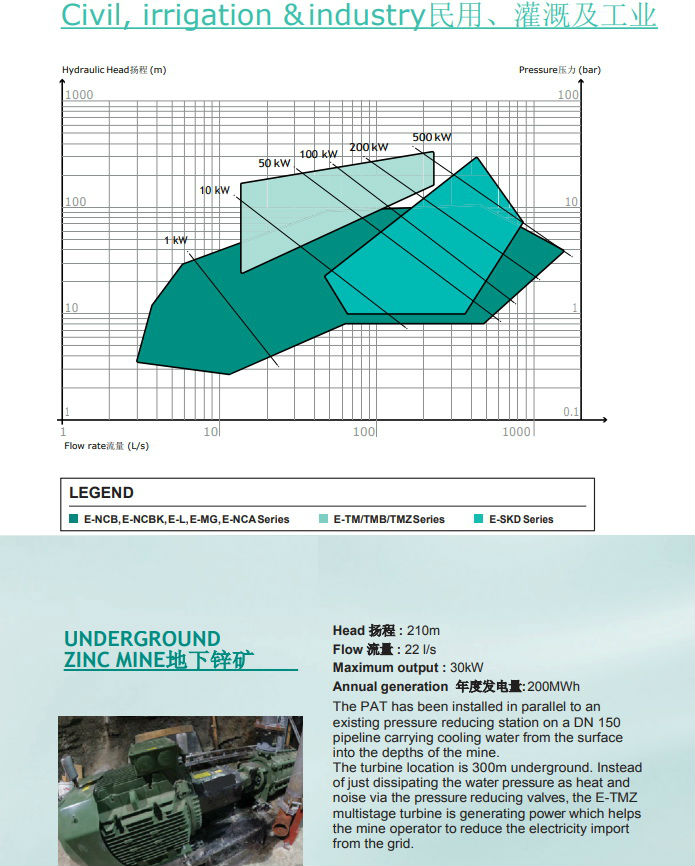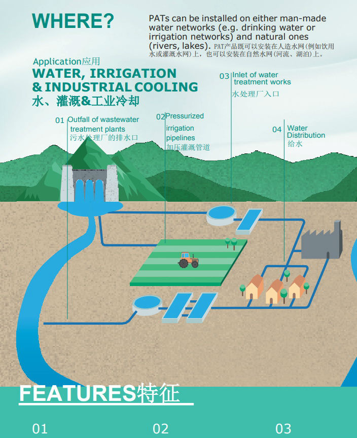 PAT適用于現(xiàn)有管道系統(tǒng)中需要降低水壓或水通過重力流入水庫的應(yīng)用,比如:污水廠的排水口、加壓灌溉管道、凈水廠的給水、礦井水處理廠的排水口、地下礦排水等;